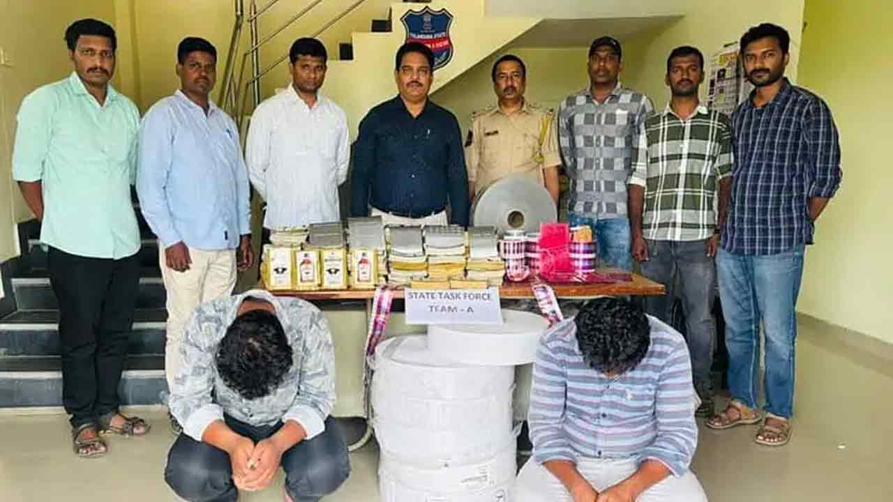 Acting on a tip-off, STF raided a printing unit linked to the Huzurnagar spurious liquor case and arrested G. Prakash and N. Rajesh, who were handed over to the Huzurnagar Prohibition and Excise Station. They are associates of the main suspect, G. Naveen Goud, who is already in judicial custody.
