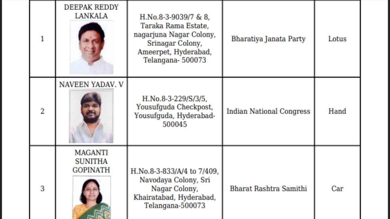 The Congress candidate Naveen Yadav will appear second with the hand symbol, and the Bharat Rashtra Samithi (BRS) candidate, Maganti Sunitha Gopinath, has been allotted the car symbol in the third place.