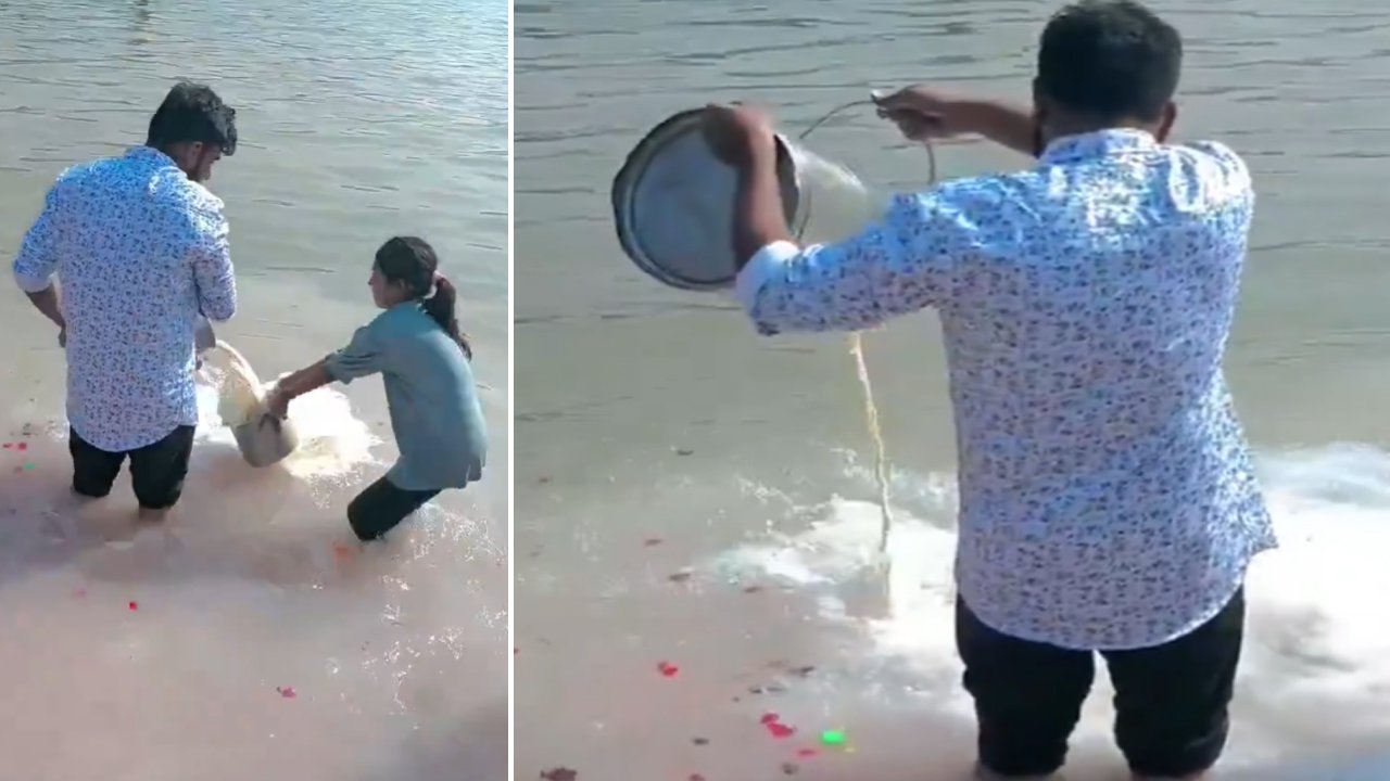 Hyderabad, Jan. 22: A viral video shows a devotee pouring milk into the Ganga River during a ritual.