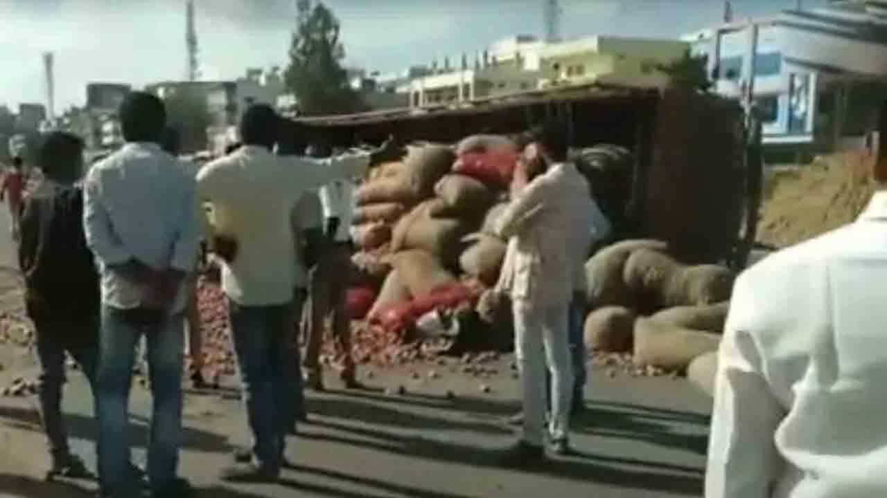 Sangareddy/Hyderabad, Aug 25 (Maxim News): A lorry carrying onions overturned on the outskirts of Isnapur in Sangareddy district. This caused a six-kilometer traffic jam on the Mumbai National Highway. On Sunday night, a lorry carrying onions lost control at Isnapur and hit a divider on the National Highway. As a result, the bags of onions in the lorry fell on the road. Even though it was Monday afternoon, the lorry was not removed from there. On the other hand, there was a severe disruption to traffic due to road widening work.
