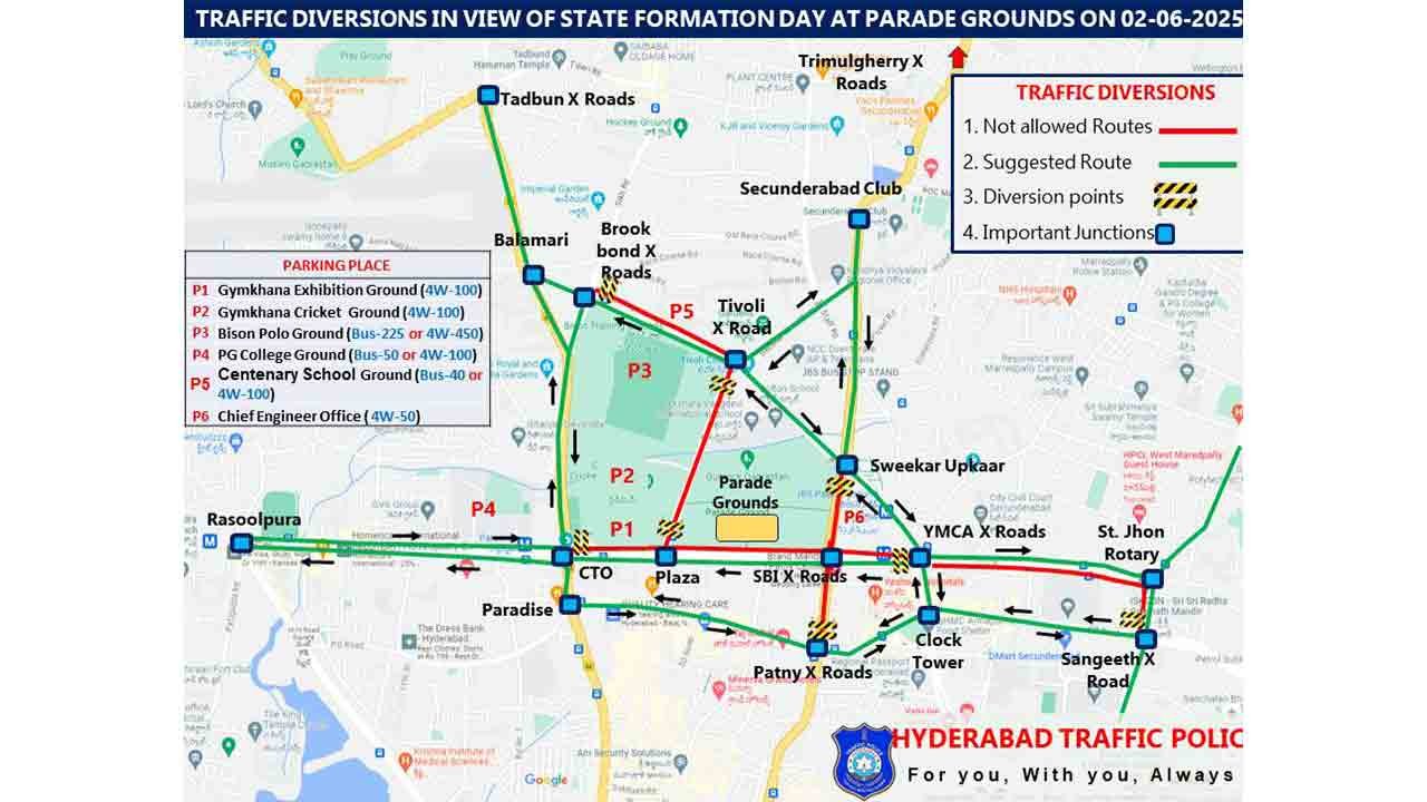Hyderabad, June 1 (Maxim News): In view of the State Formation Day celebrations to be held at Gun Park in Nampally and Parade Ground on June 2, there will be certain traffic restrictions placed in the surroundings between 6 am and 1 pm.
