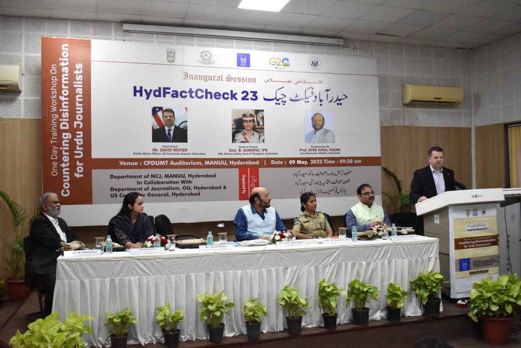 Hyderabad, 09 May: “It was imperative for Citizens to be aware of the misinformation eco system and counter it through truthful information. Misinformation threatens democracies across the world, as there is divergence of opinion and no shared understanding of basic facts.” said Mr. David Moyer, Public Affairs Officer, United States Consulate General, Hyderabad today at Maulana Azad National Urdu University (MANUU). He was addressing the inaugural session as the Chief guest of one Day Training Workshop ‘Countering Disinformation for Urdu Journalists’ organized by the Department of Mass Communication and Journalism (MCJ), MANUU in collaboration with Department of MCJ, Osmania University (OU) and US Consulate General, Hyderabad. Prof. Syed Ainul Hasan, Vice Chancellor, MANUU presided over.