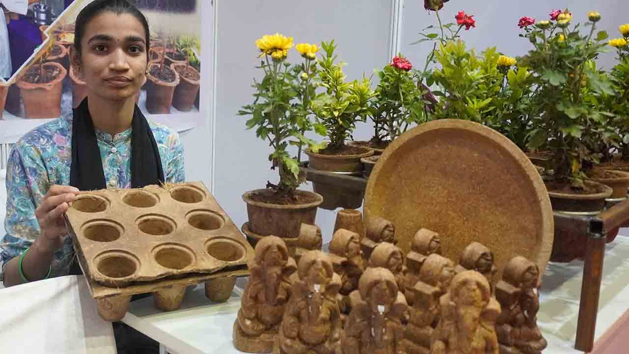 Srija, a B.Tech student from BVRIT-H and founder of Srija Green Galaxy Pvt. Ltd., has developed eco-friendly Lord Ganesha idols, biodegradable pots, teacups, and plates — all crafted from groundnut shells and agro-waste.